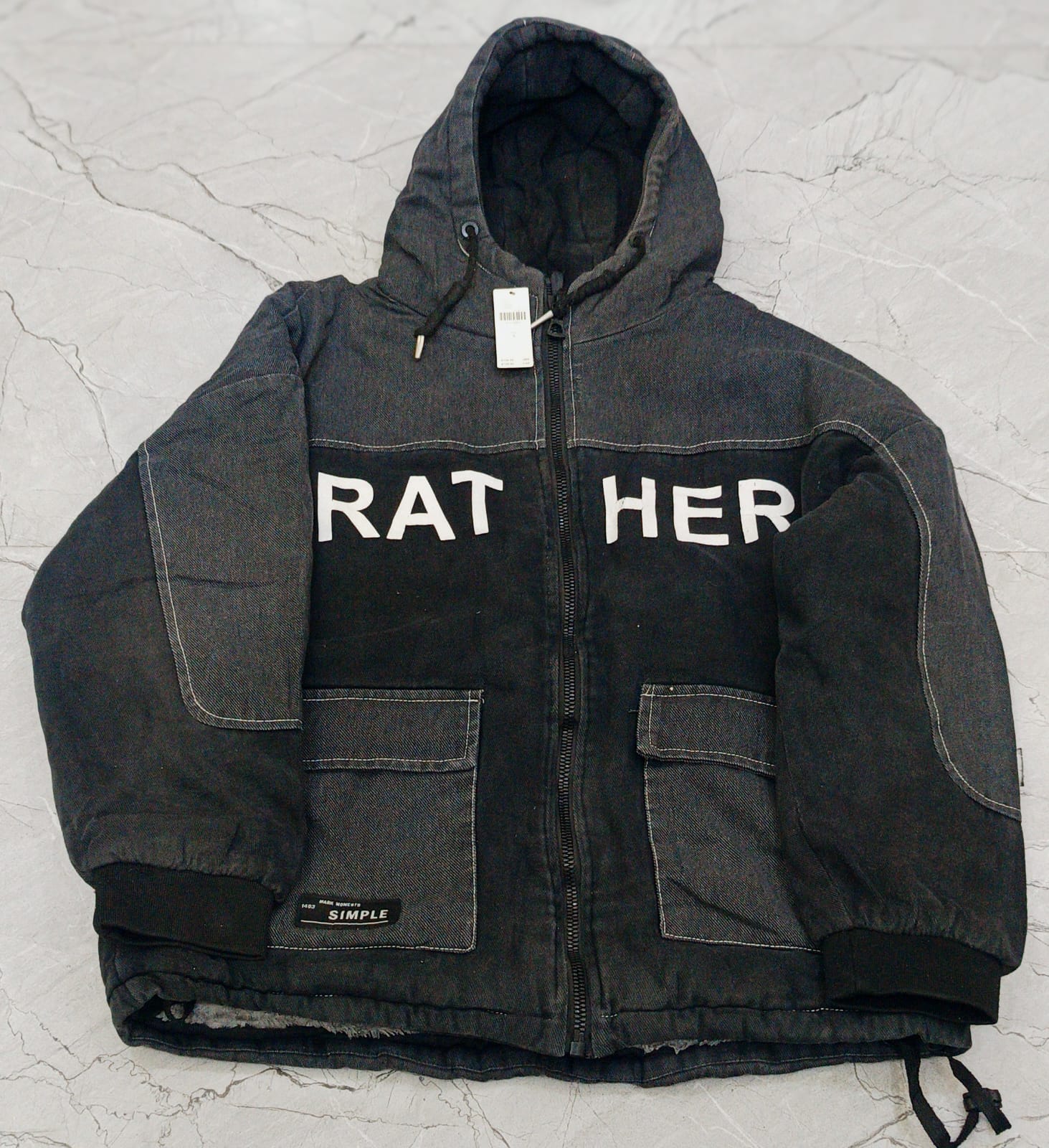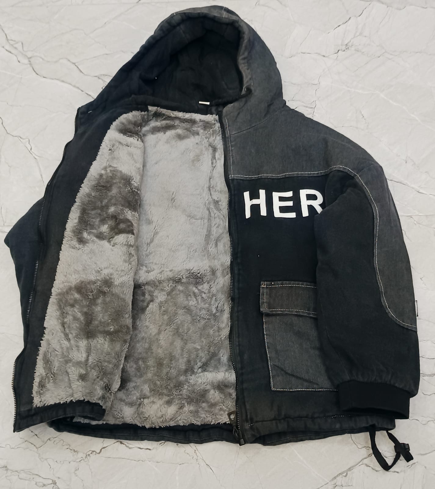 Stay warm and comfortable with this stylish black hooded winter jacket, perfect for reuse. Featuring a soft grey faux fur inner lining, it provides excellent insulation for cold weather. The jacket includes a front zipper closure, a cozy hood, and a practical front pocket for everyday essentials. The bold “HER” print on the front adds a modern, trendy touch.